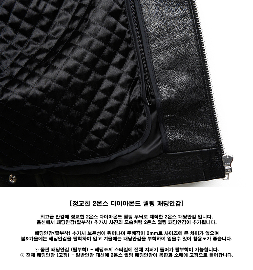 * (패딩안감 추가) 2온수 퀼팅 다이아몬드 최고급 소재로 제작된 패딩안감을 몸판패딩안감 (탈부착) & 몸판패딩안감 (고정) & 전체패딩안감 (고정) 추가 가능합니다.