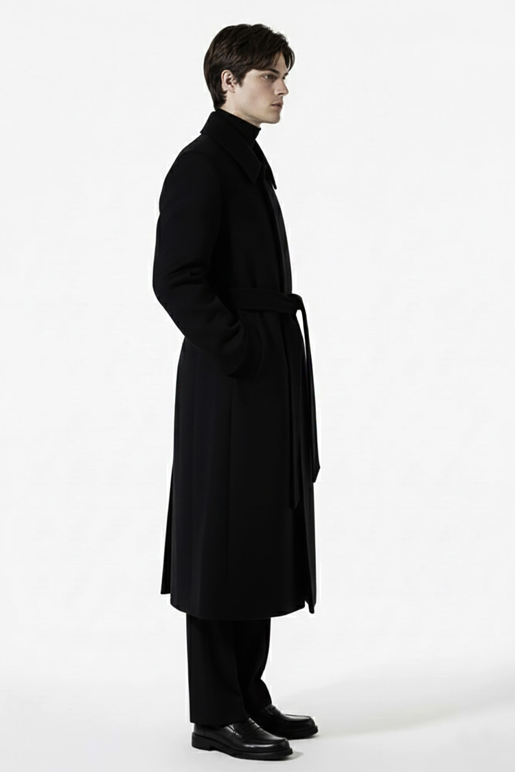 HIGH-END 개버딘 울 100% 발마칸 로브 맥코트 블랙 벨트 롱코트SALE