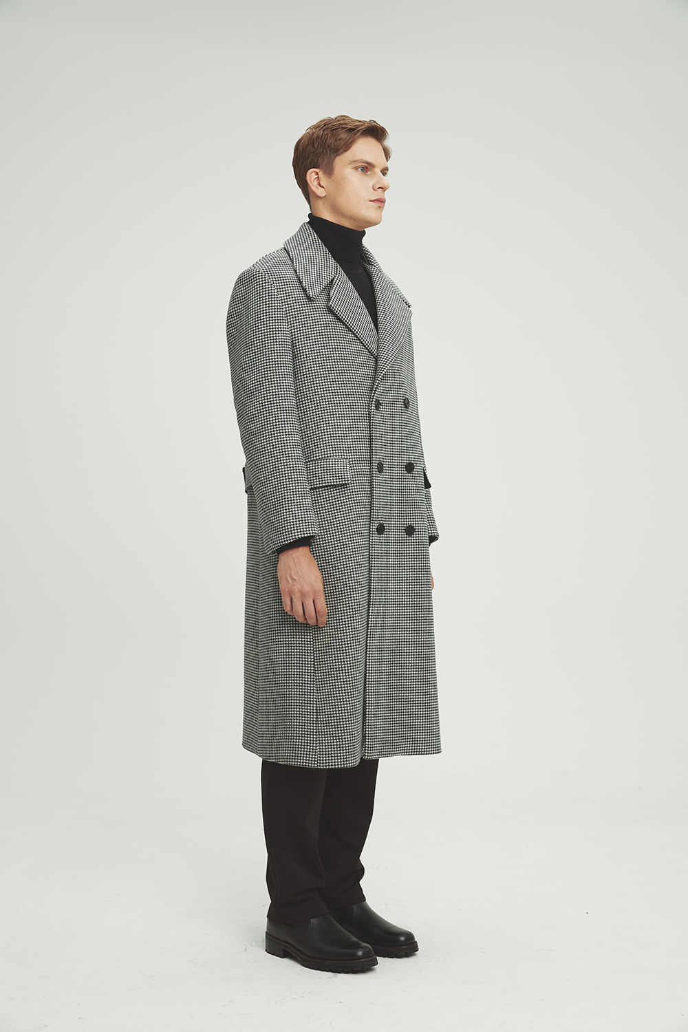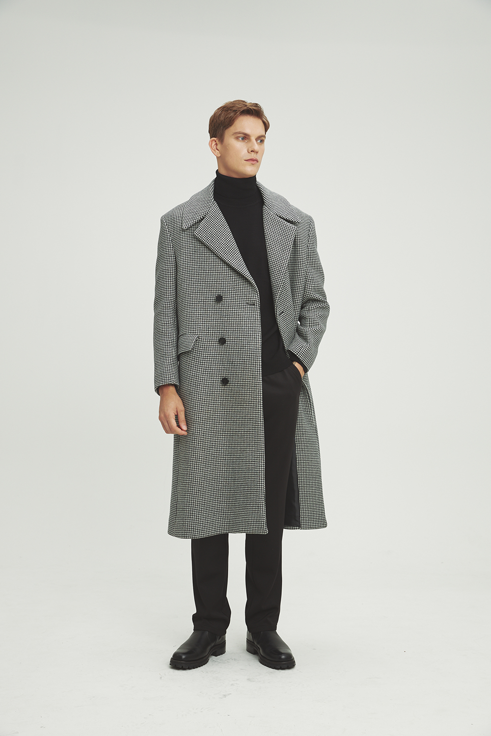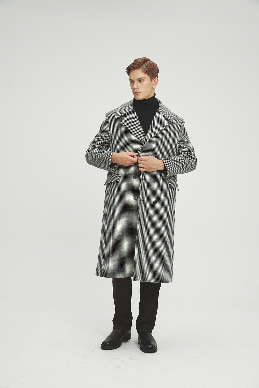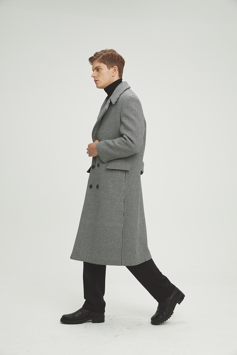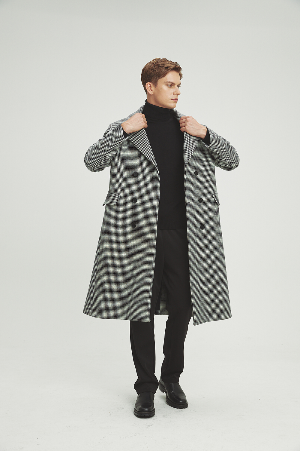 고급스러운 하운드-투스 체크 더블 슈퍼 롱코트, 두툼한 두께감으로 보온성이 뛰어난