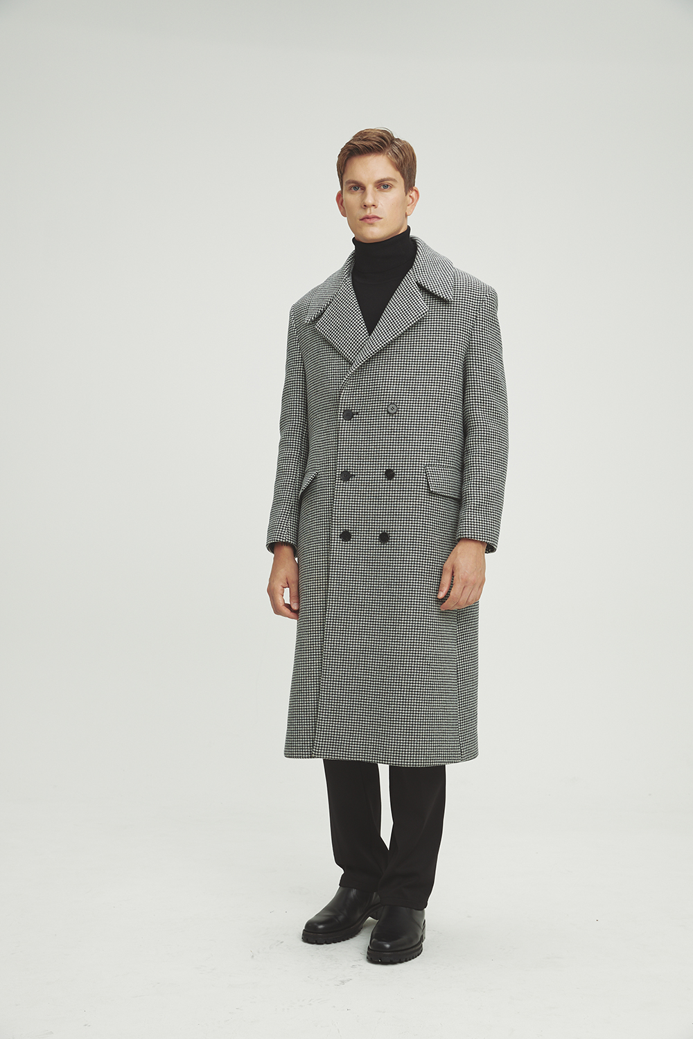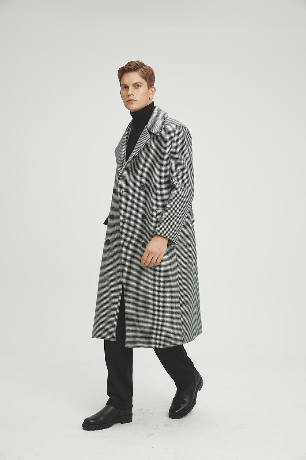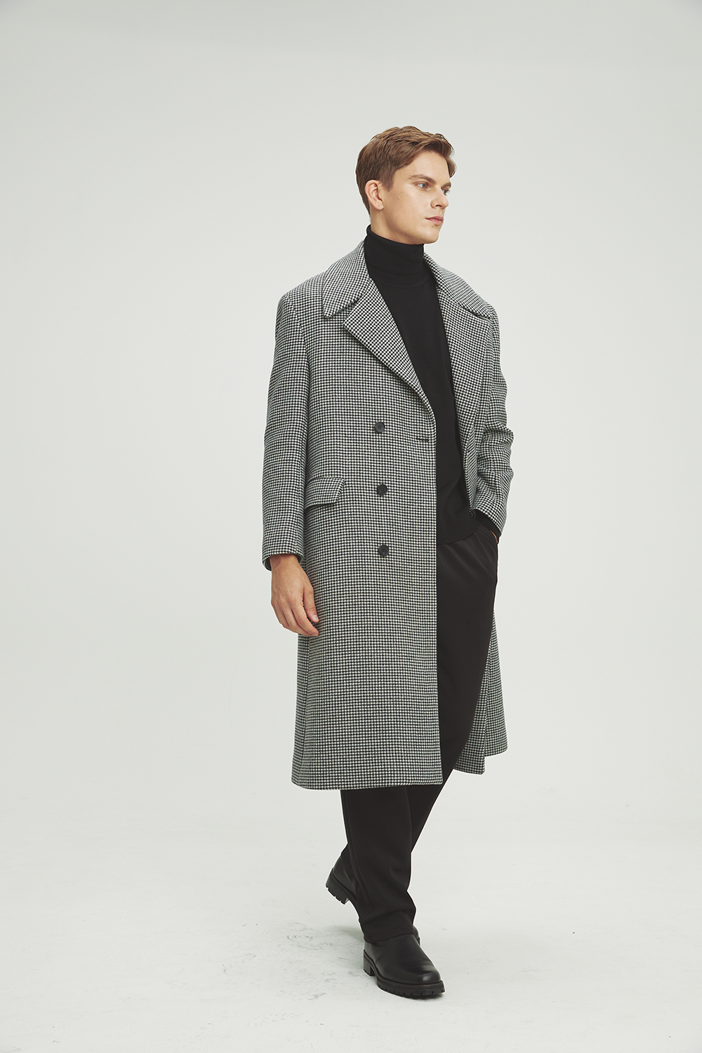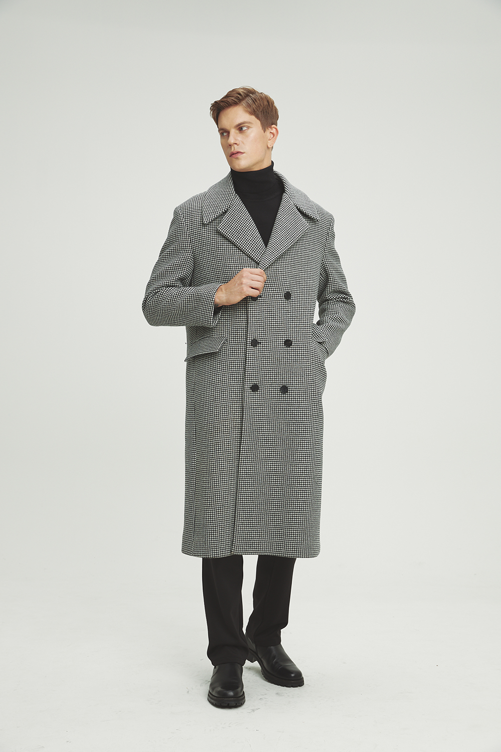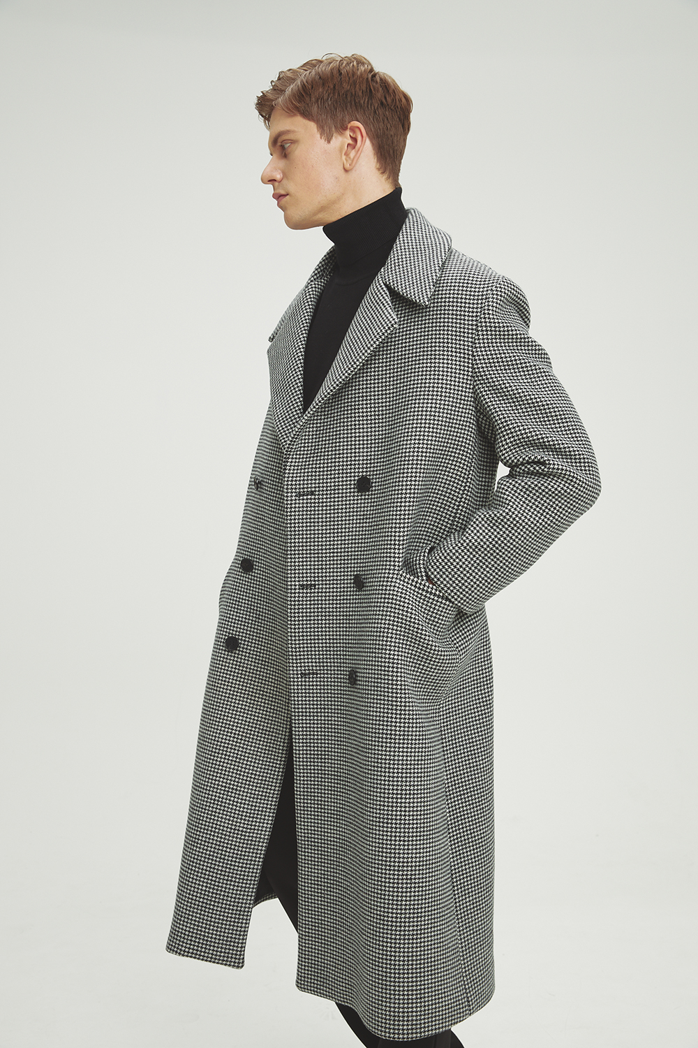 고급스러운 하운드-투스 체크 더블 슈퍼 롱코트, 두툼한 두께감으로 보온성이 뛰어난