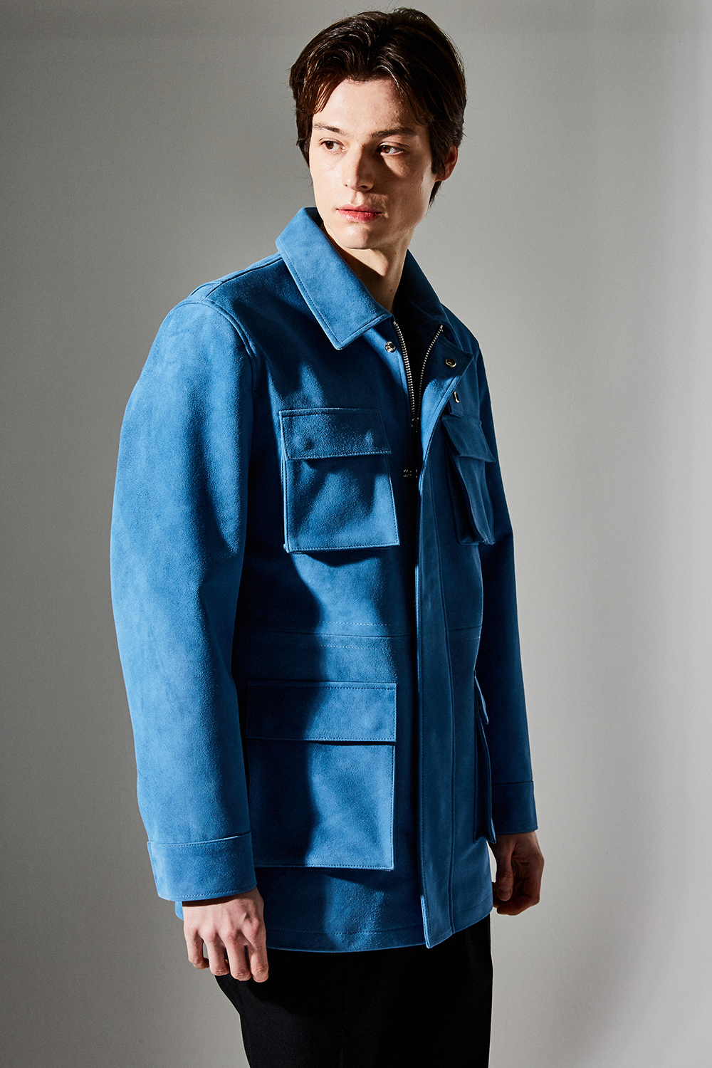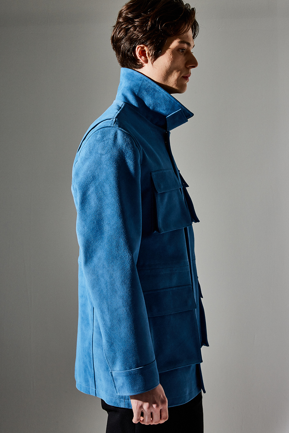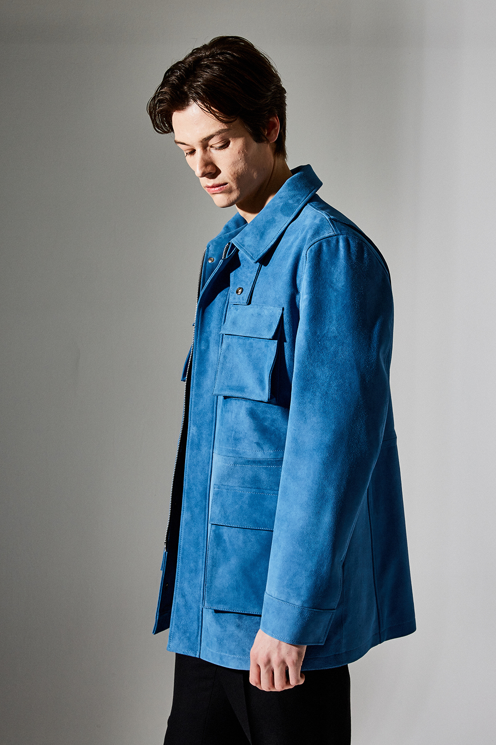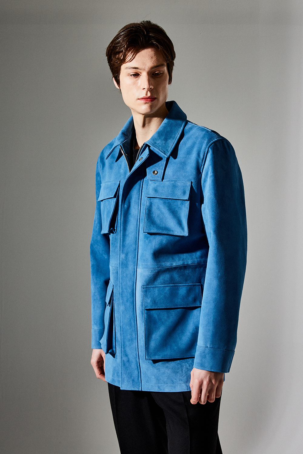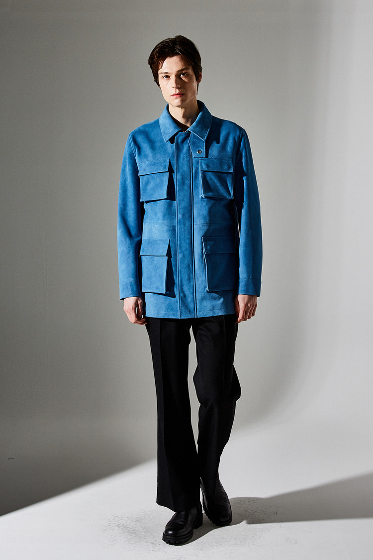 스웨이드 SUEDE 100% / 색상 DEEP-SKYBLUE 딥-하늘색 / 소뿔단추 100% / JAPAN YKK TWO-WAY ZIPPER 실버 투웨이지퍼 100%