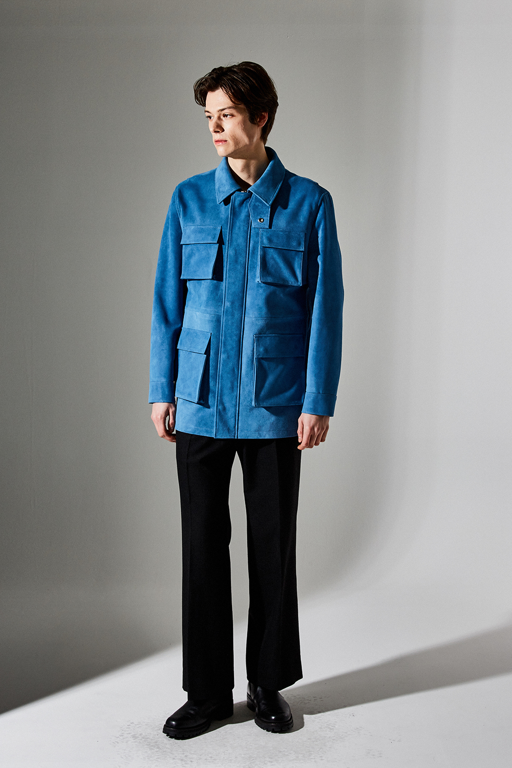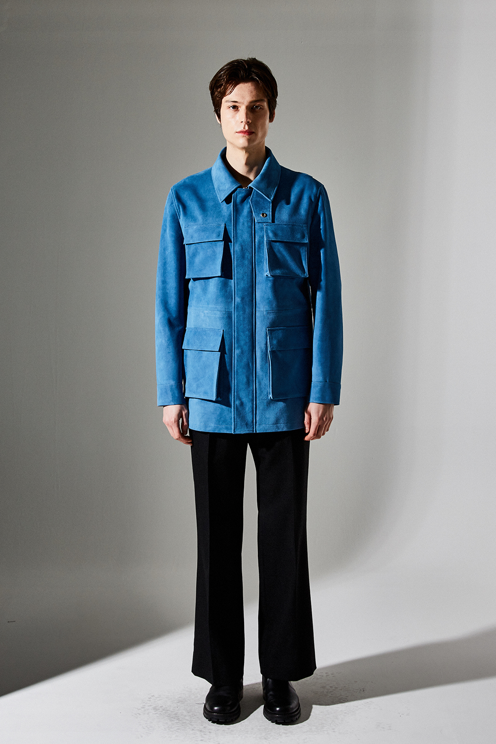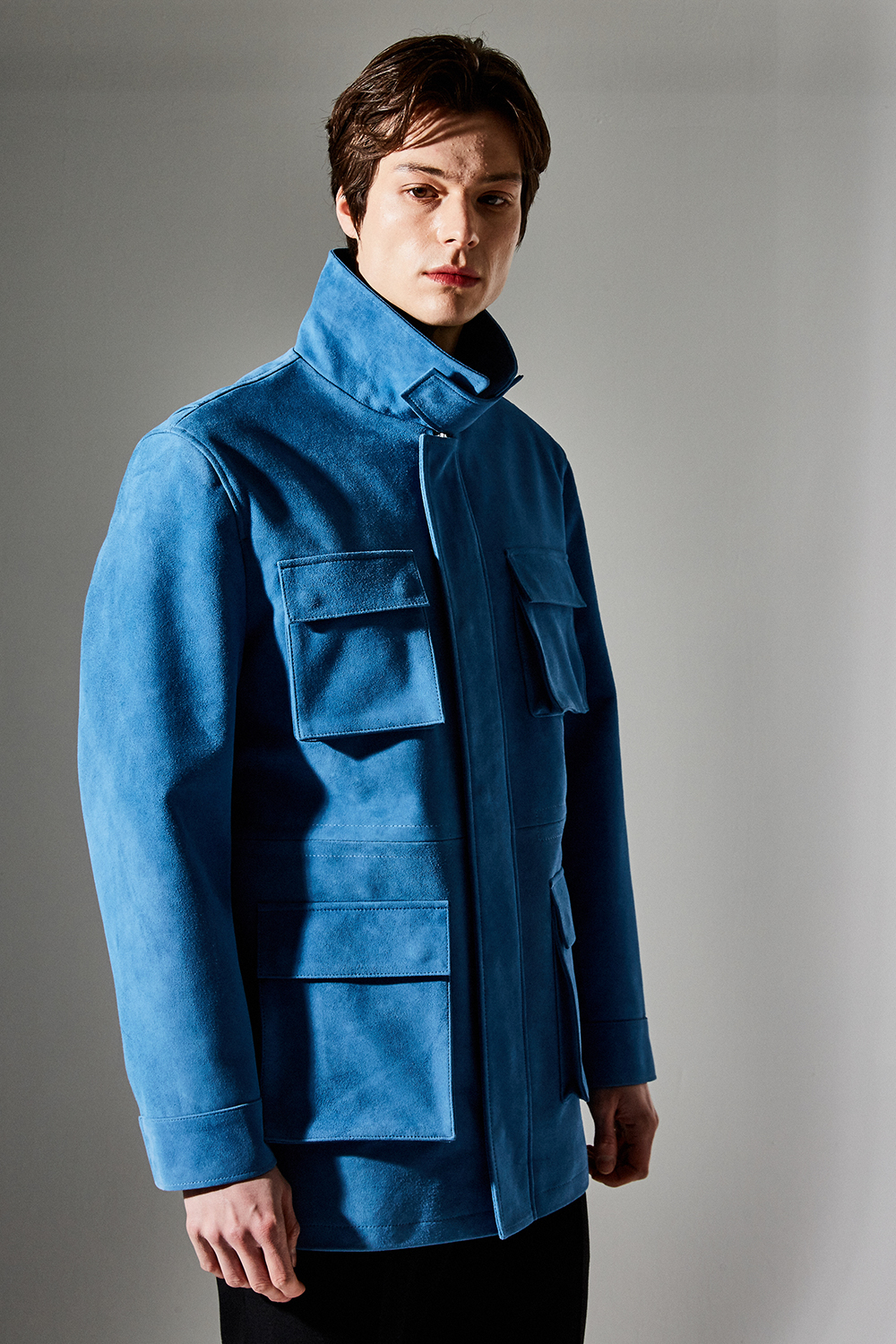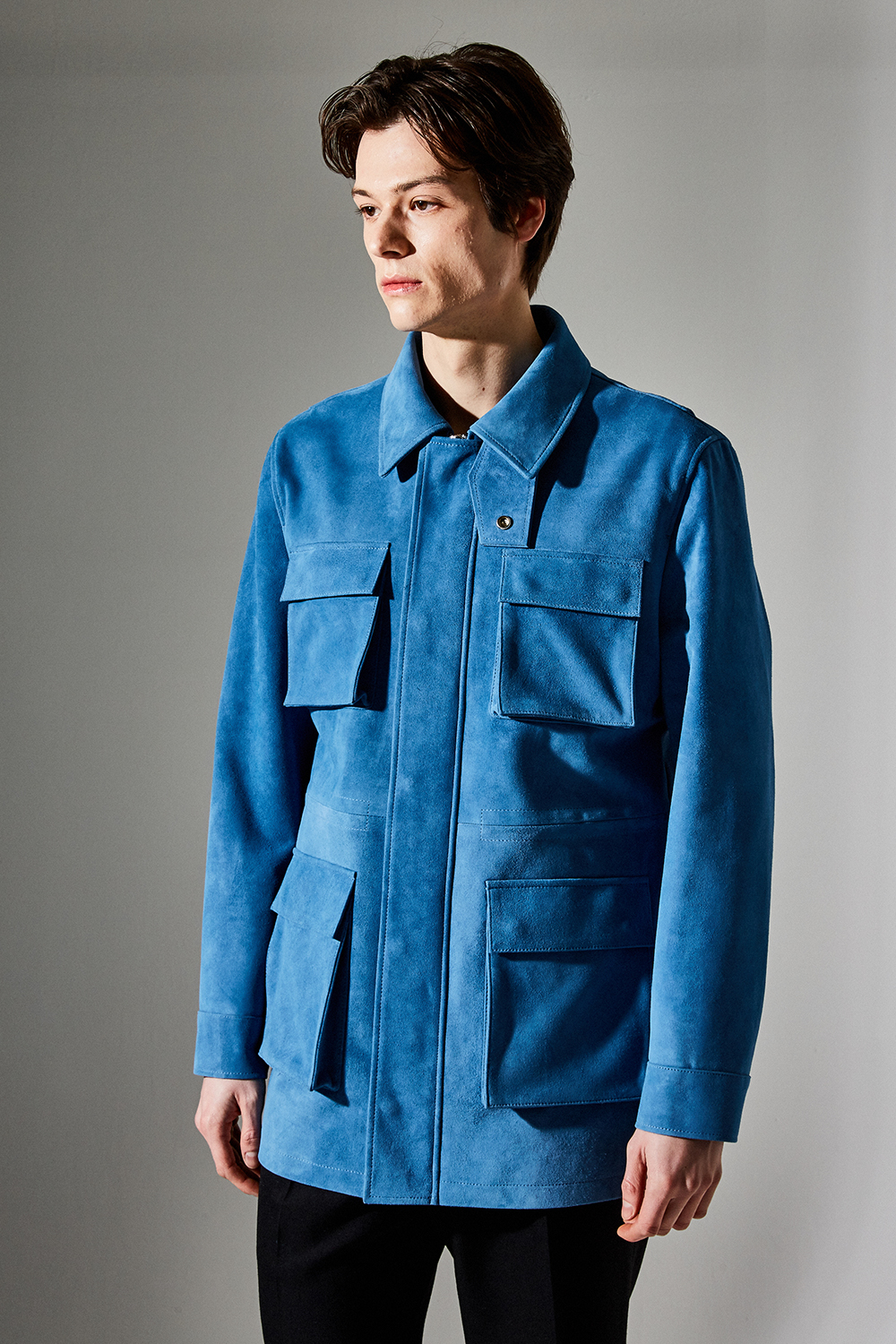 스웨이드 SUEDE 100% / 색상 DEEP-SKYBLUE 딥-하늘색 / 소뿔단추 100% / JAPAN YKK TWO-WAY ZIPPER 실버 투웨이지퍼 100%