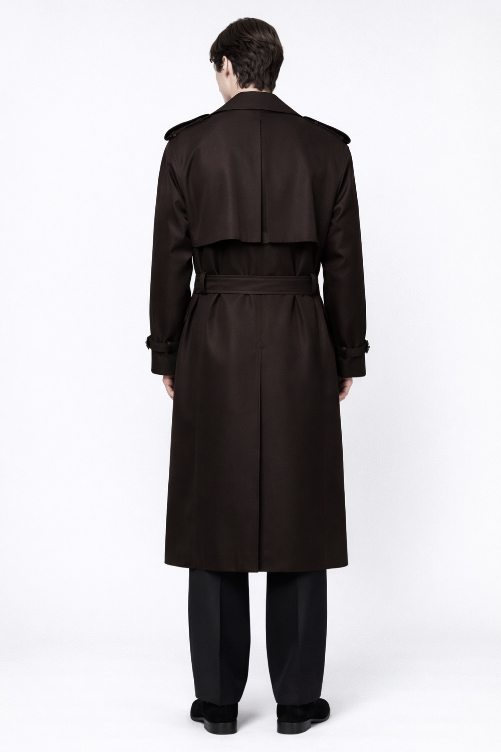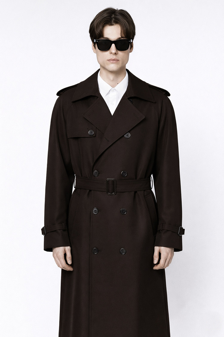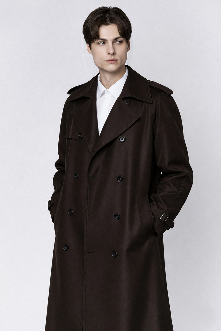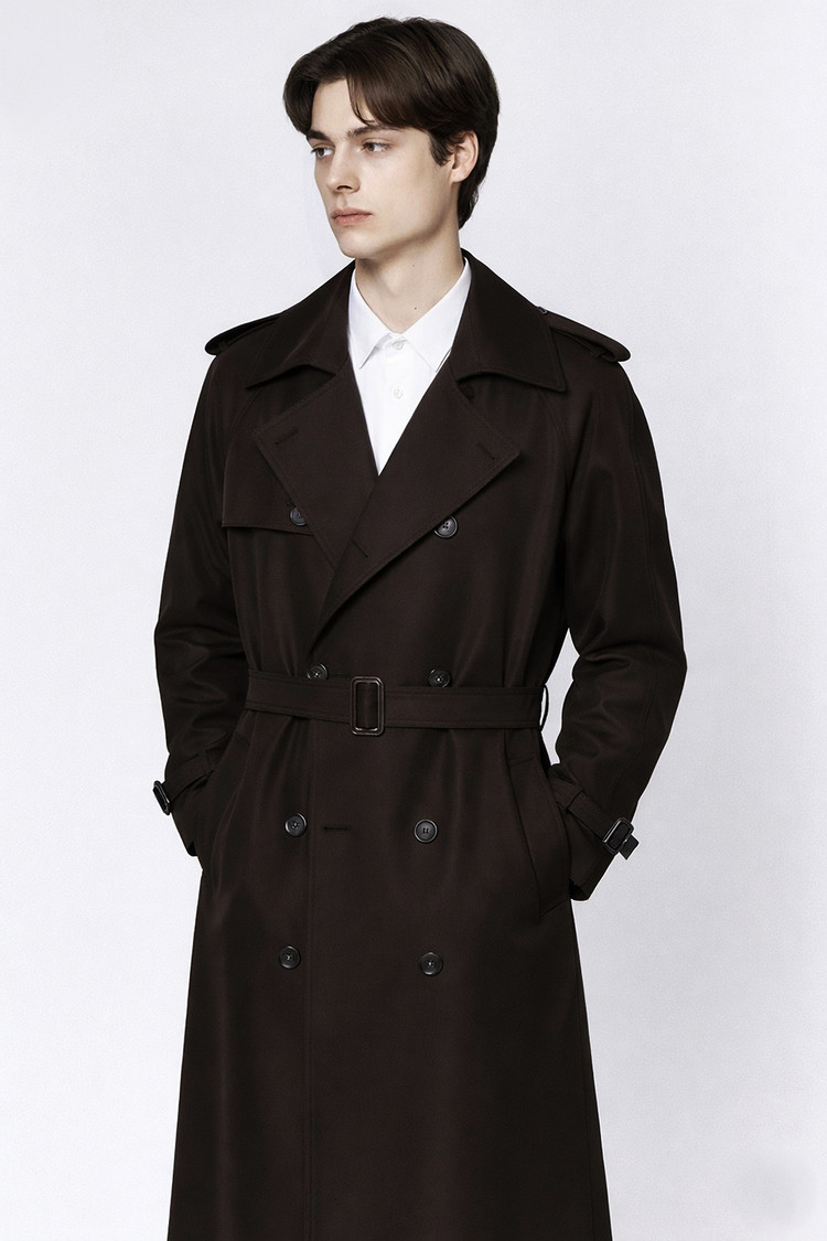 HIGH-END 럭셔리 개버딘-울 100% 클래식 딥-브라운 롱 트렌치코트SALE