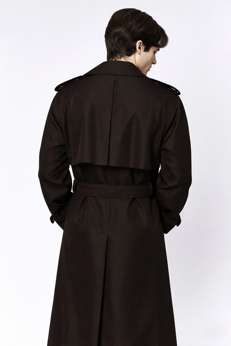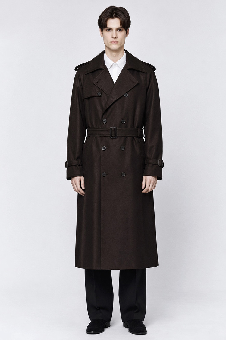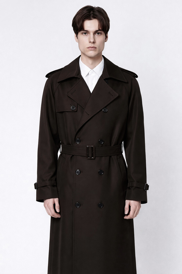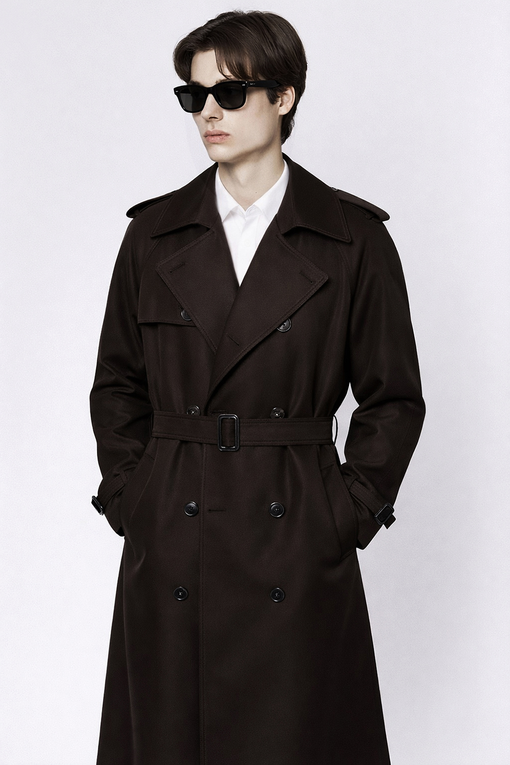 HIGH-END 럭셔리 개버딘-울 100% 클래식 딥-브라운 롱 트렌치코트SALE