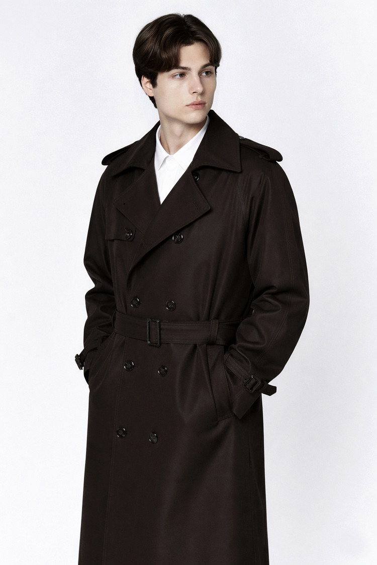 HIGH-END 럭셔리 개버딘-코튼 100% 클래식 딥-브라운 롱 트렌치코트SALE